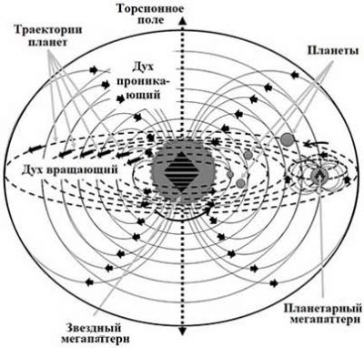 | Дух вращающий и Дух проникающий, которыми наделен каждый мегапаттерн, и представляют собой форму проявления силы притяжения и магнитного поля структурированных мегаобъектов. Силы притяжения – это действие сил Духа вращения структурированных мегаобъектов или взаимодействие структурированных мегаобъектов с неструктурированными. Такое взаимодействие осуществляется по своим законам. На рисунке 17.1 приведена схема взаимодействия мегаобъектов солнечной системы для звездного и планетарных мегапаттернов, наделенных Духом проникающим и Духом вращающим. Данная структура характерна для любой звездной системы в галактиках. Траектории движения планет находятся в плоскости эклиптики, которая перпендикулярна мегапаттерну звезды. Расположение планет в звездной системе определяется структурой Духа проникающего в мегапаттернах звезды и планет и формой их взаимодействия. | .